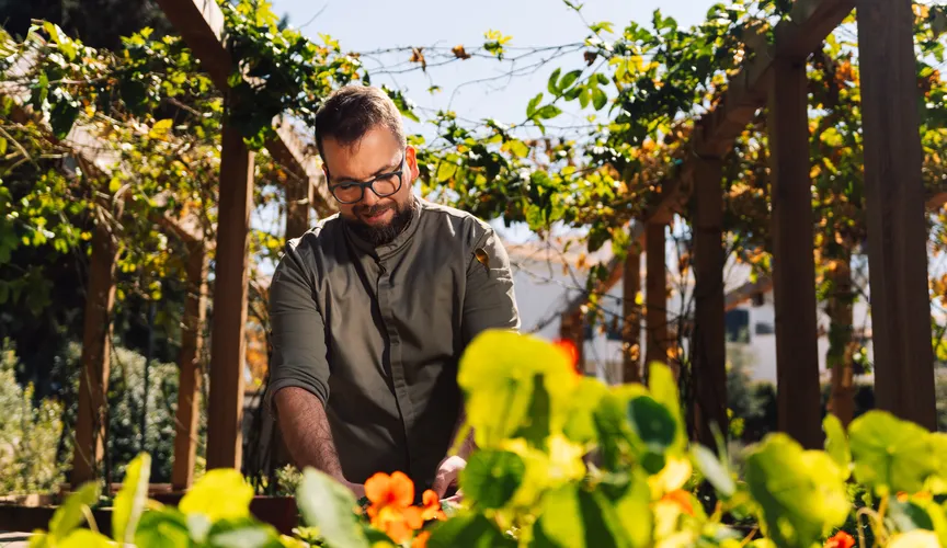 Num ambiente reservado junto ao Jardim das Aromáticas, acompanhe a finalização dos pratos e descubra as histórias, técnicas e inspirações por trás de cada criação.